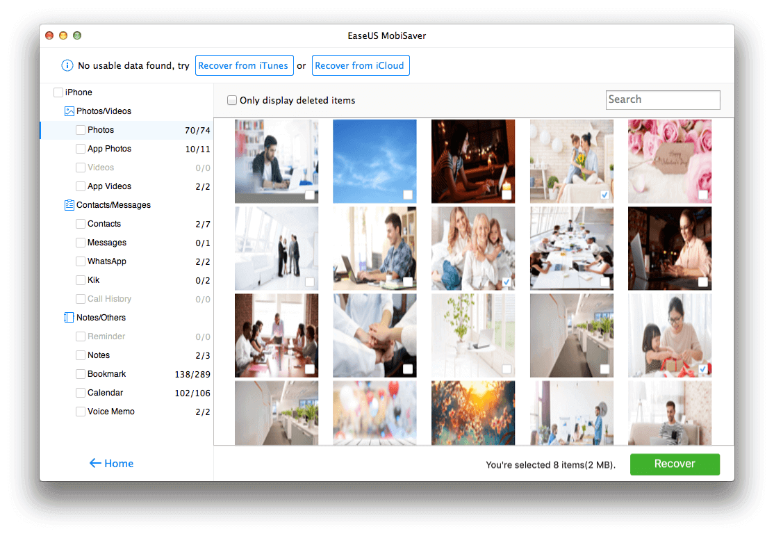 EaseUS MobiSaver can help you quickly recover iPhone data of different types, such as photos, videos, contacts, messages, Safari bookmarks, notes, voice memos and WhatsApp chat history.