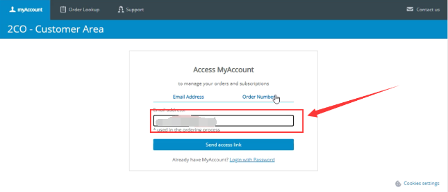 Step 2. If this is the first time you login 2Checkout Customer Area, Fill in your Purchase Email Address or Order Number and click Sent access link.