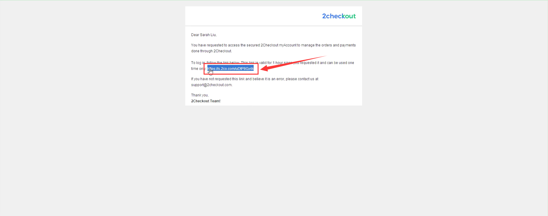 Step 3. If the email address you entered is associated with a 2Checkout order, you will shortly receive an email with a login link valid for 1 hour. Click on the link in the email to log into MyAccount.