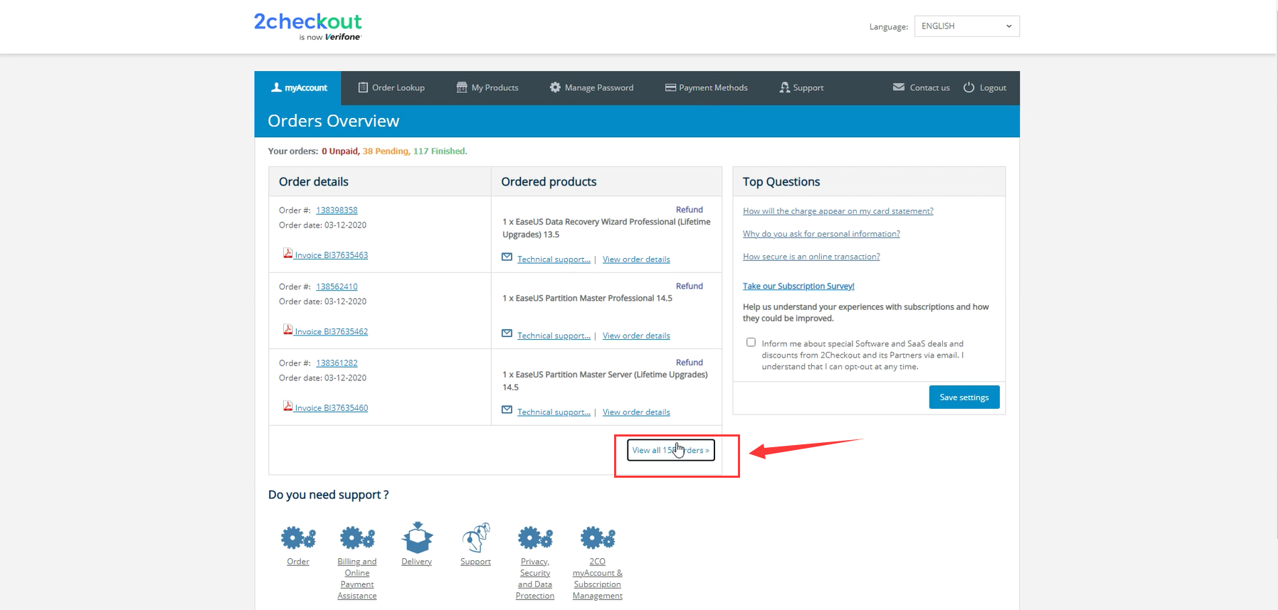 Step 4. After logging into MyAccount, click View all XXX orders to get a list of all your 2Checkout orders.