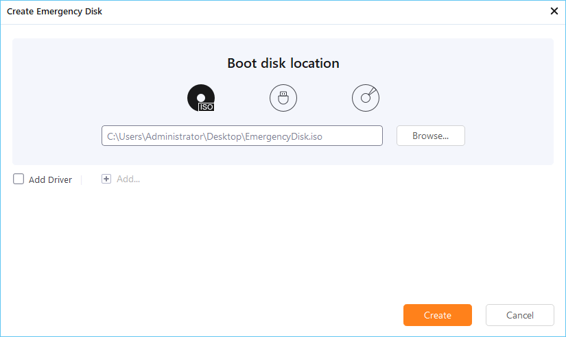 3. Choose USB as the disk location to create the emergency disk which will help you boot computer when it fails to boot or restore the system to dissimilar new PC.