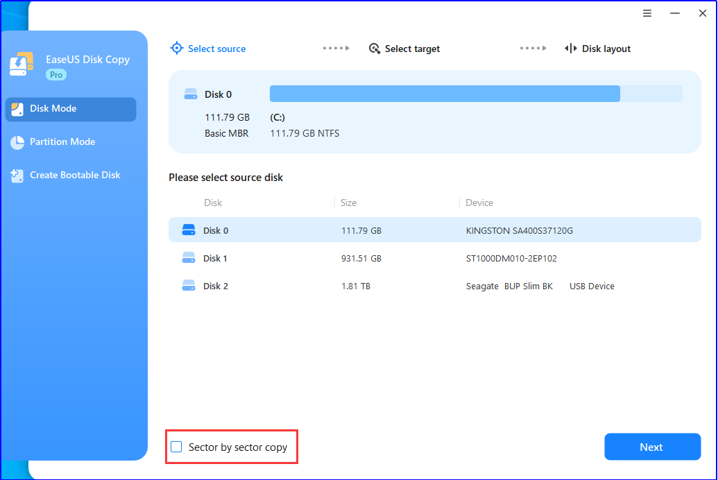 Step 1. Choose "Disk mode" and select a source disk, then click “Next”.