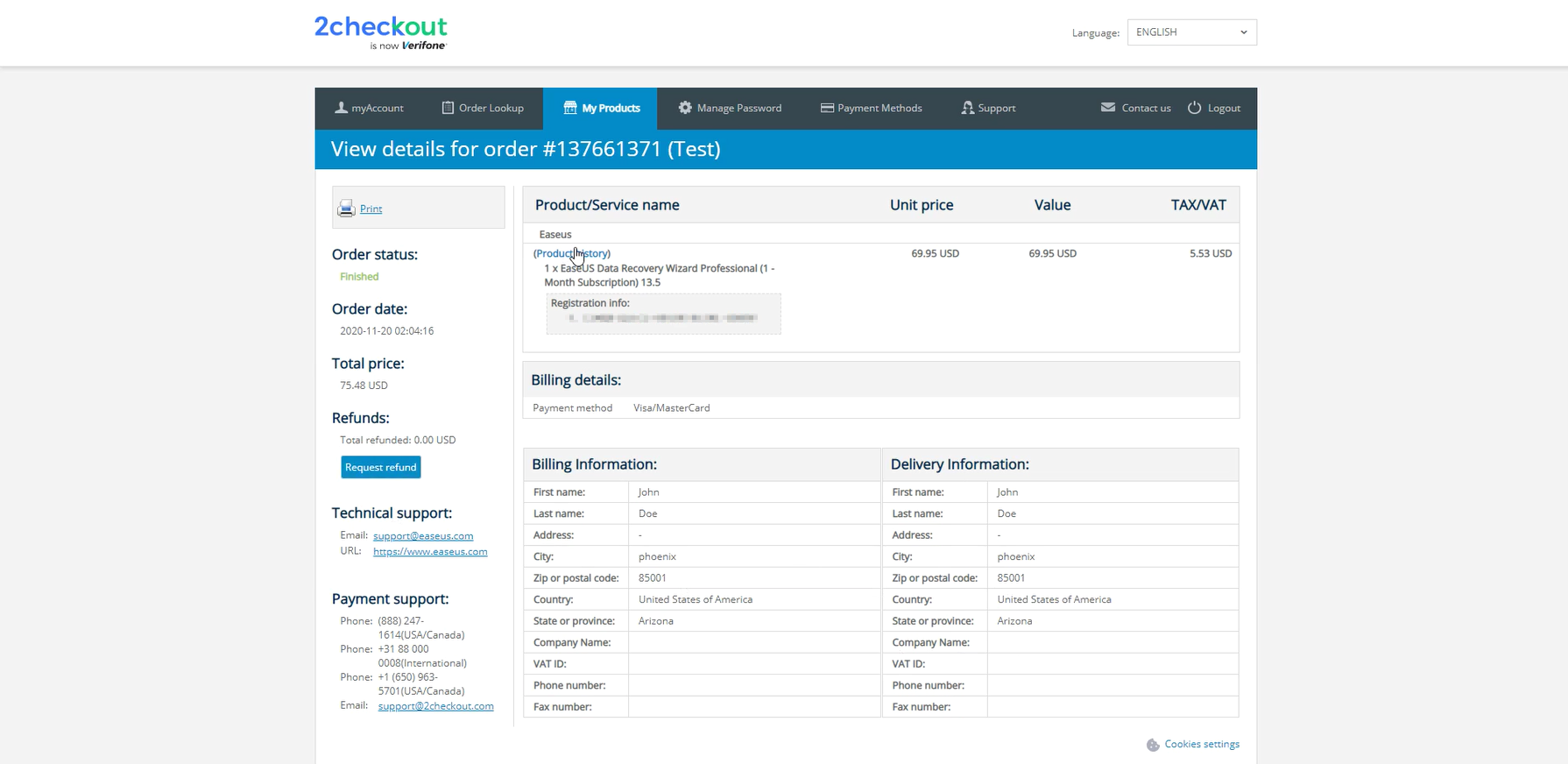 Step 6. You will access the page to review the detailed information for this order, including your billing and delivery information, license code, unit price and tax information etc. Click Product history on this page.