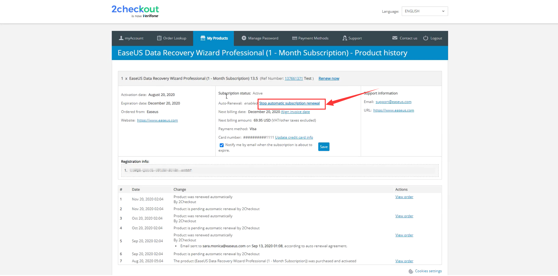 EaseUS cooperates with two shopping cart vendors, 2Checkout and Cleverbridge. Before you unsubscribe from your renewal service, please check your order email to confirm which vendors your order belongs to and follow instructions accordingly.